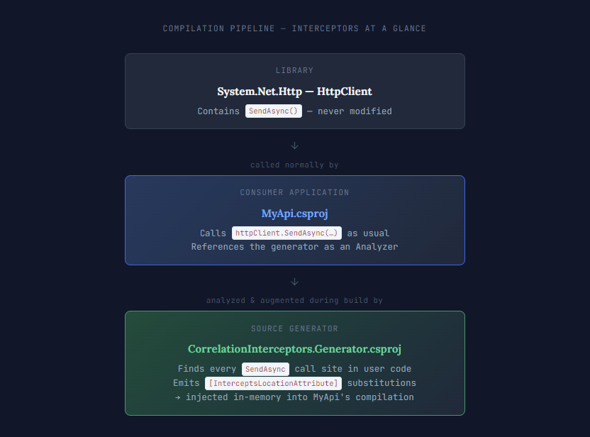 Interceptors are not written by hand, they are emitted by a Source Generator that inspects the compilation, finds the target call sites, and injects the substitution code as a generated file. The consumer project never changes.
